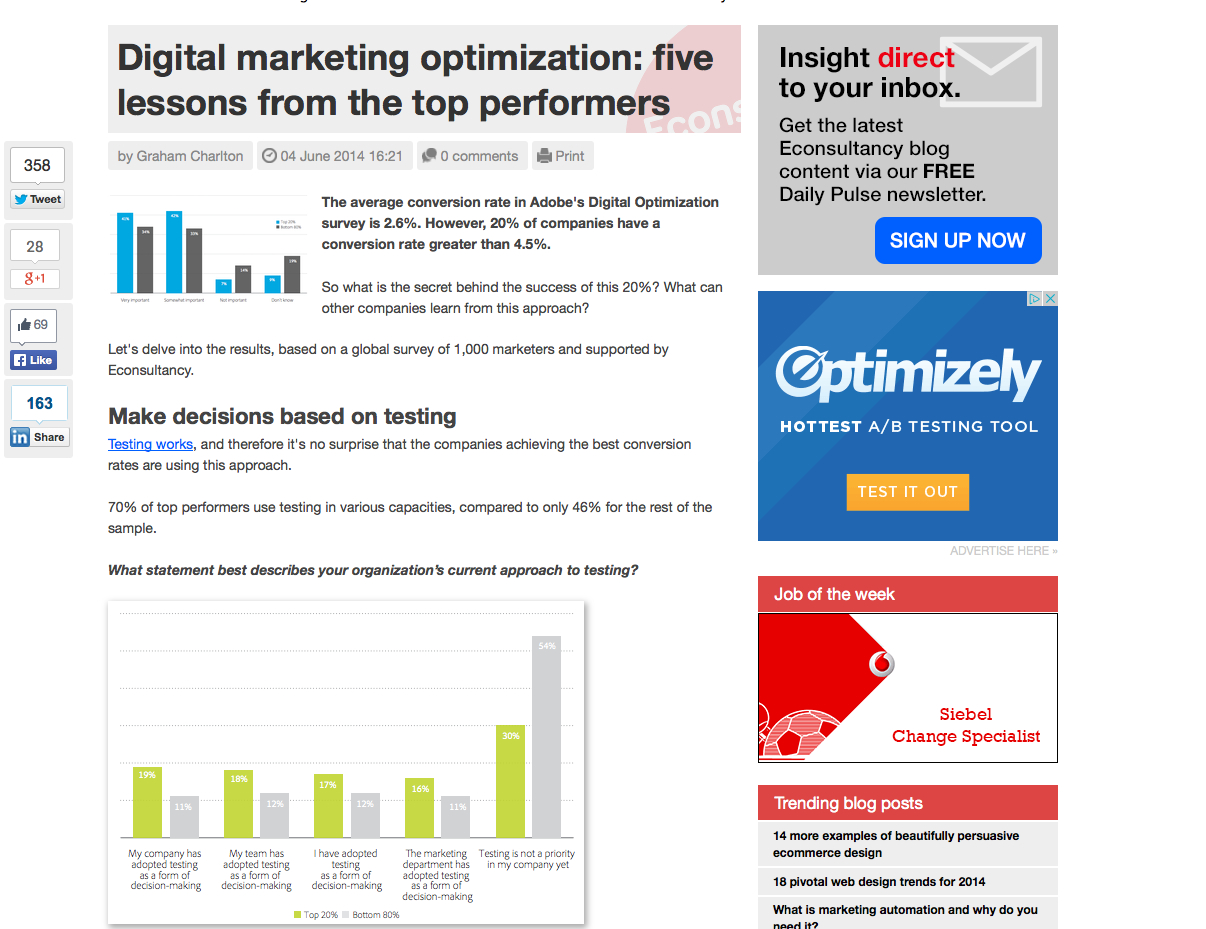 4) We love the work Econusltancy does - typical (sorry Americans) bright, savvy technical Europeans who bake in great strategy along with “list loaded” headlines - the Headline, Column under the headline, screen right (newsletter at top, then two stacked ads and trending blog posts).